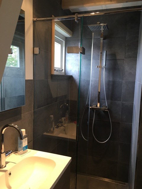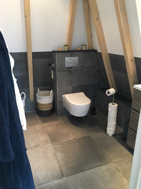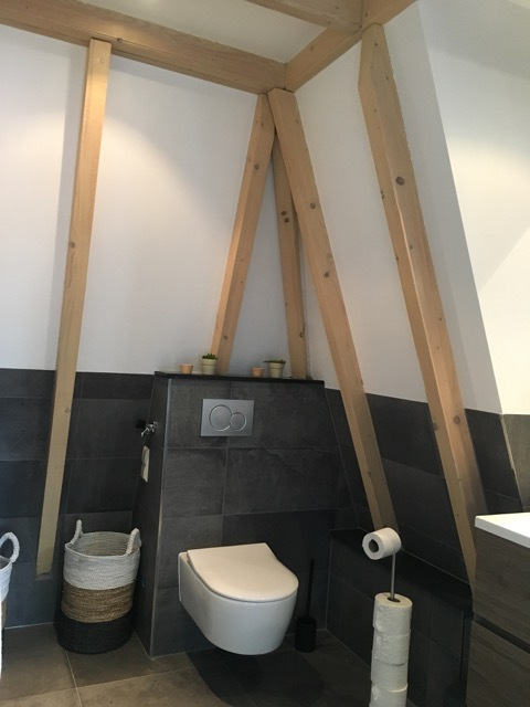 Badkamer met Houten Balken Aannemersbedrijf R.Breugelmans Het is een mooi contrast de houten balken en de mat witte badkamer. Hierdoor wordt er een industrieel karakter en een stoere uitstraling gecreëerd. [Show slideshow]